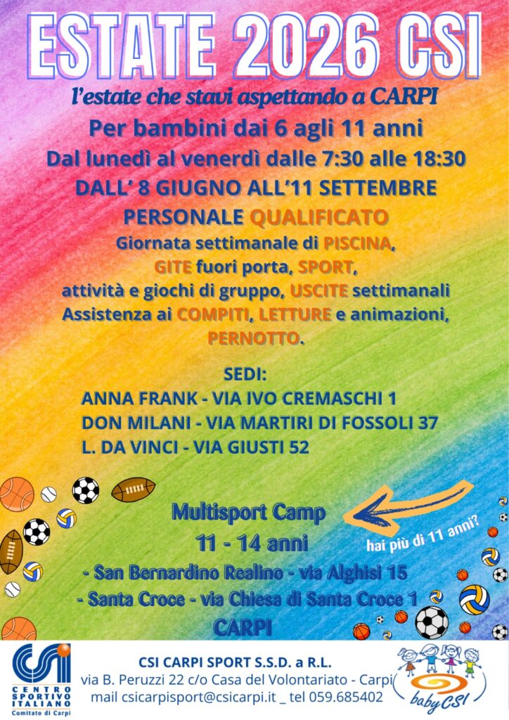 DESCRIZIONE DELLE ATTIVITA’ CSI Carpi propone centri estivi dai 6 agli 11 anni (scuola primaria), vengono proposte attività sportive, laboratoriali e didattiche, una giornata di piscina, uscite sul territorio e gite fuori porta