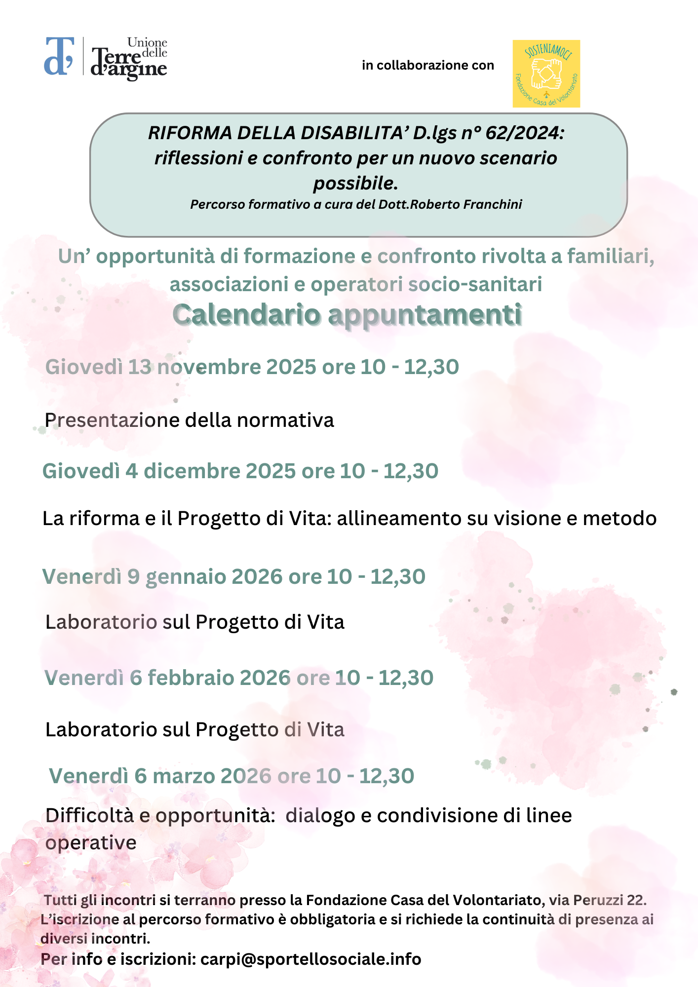 A Carpi, presso la Fondazione Casa del Volontariato, una opportunità di formazione e confronto rivolto a familiari, associazioni e operatori socio sanitari, organizzato dall’Unione Terre d’Argine, in collaborazione con Sosteniamoci